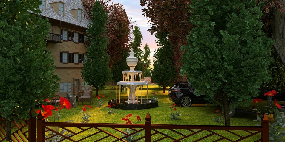 Nel giardino, la fontana gorgoglia come un pensiero non del tutto compiuto, circondata da alberi che sembrano sussurrare segreti. I fiori rossi, come lacrime di gioia, danzano nel vento, mentre il cancello di legno, un guardiano silenzioso, osserva il passare del tempo.
