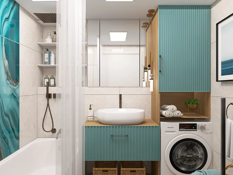 Была задача обновить ванную комнату, с имеющимися конструктивными особенностями. Встроили зеркальный шкаф и стеллаж с душевой стойкой и полочками, стиральную машинку и раковину. Стиль задала керамогранитная плитка цвета лазури.