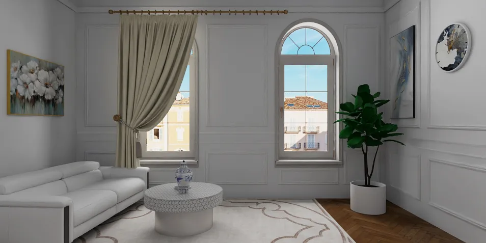 Светлые стены, обрамленные изящными рамами, словно обнимают уютный диван. Шторы, как нежные облака, плывут в светлом воздухе. Каждое окно открывает мир, но остаётся лишь взглядом, ведь в этом уединении прячется настоящая жизнь.