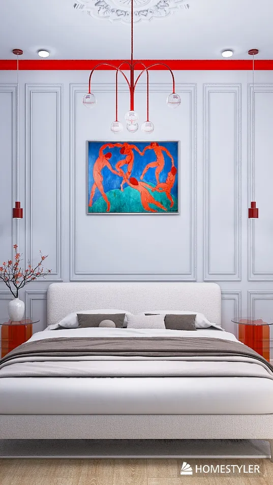 Эта спальня, где синий встречается с красным, словно танец двух страстей. Линии стен подчеркивают округлые формы, а светильники, как звезды, освещают пространство. Здесь каждый штрих — это приглашение к мечтам, но не позволяйте себе забыть о реальности.