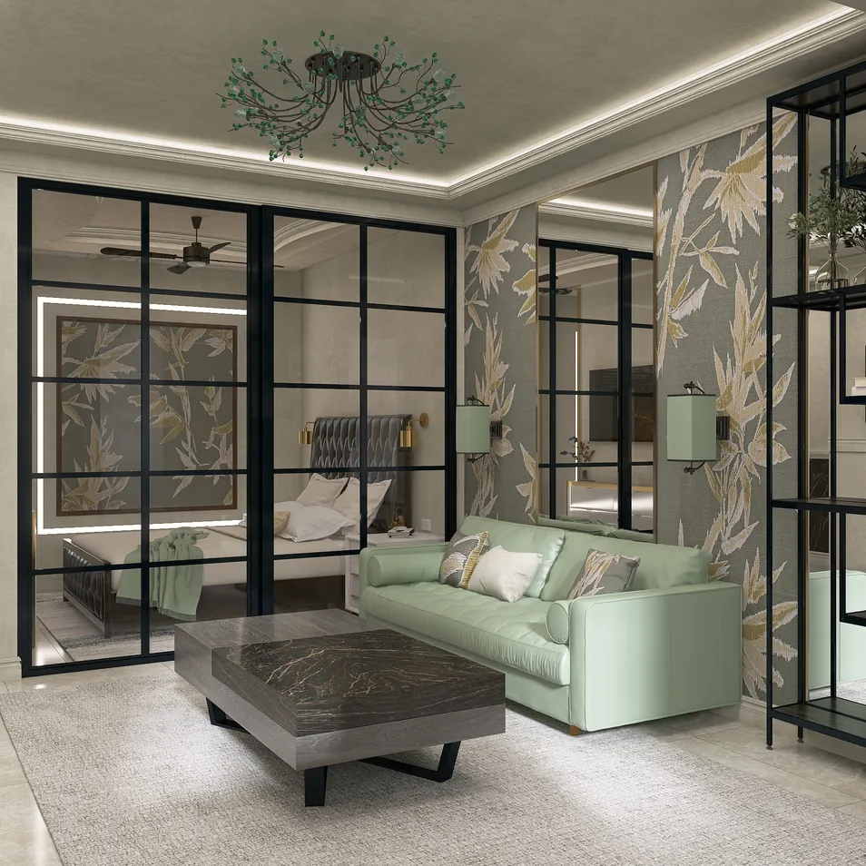 Квартира студия. С изолированной спальней. Выполнена в едином стиле в нежных пастельных тонах.