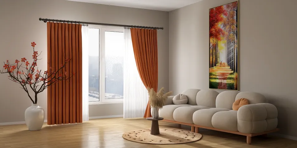 В этом светлом пространстве мягкий диван обнимает уют, а оранжевые шторы, словно теплые объятия, придают комнате жизнерадостный оттенок. Дерево с осенними листьями шепчет о прощании с летом, а картина на стене приглашает в мир мечт.