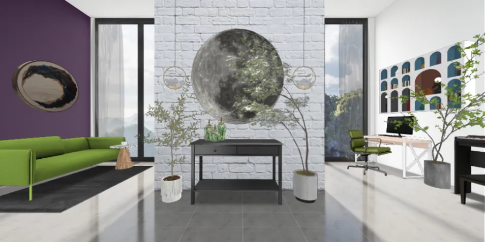 Кусочек прихожей,с видом на кабинет и гостиную. Квартира с открытой планировкой. Дизайн современный, относительно светлый,с яркими акцентами и природными аксессуарами в виде больших растений в горшках.