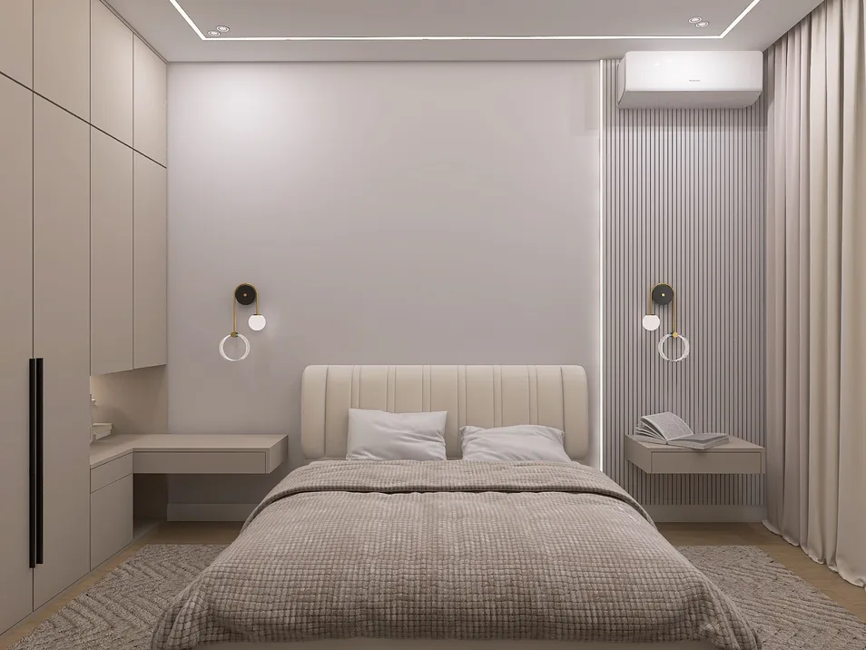 В этой спальне царит гармония — мягкие линии и теплые оттенки создают уют. Стены, обрамленные вертикальными панелями, как будто шепчут о спокойствии, а светильники добавляют легкую нотку элегантности. Здесь каждый элемент воссоздает ощущение домашнего уюта.