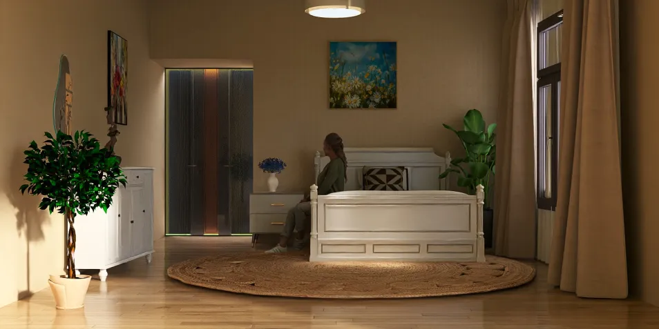 В этом пространстве, где свет мягко обнимает стены, застыли мгновения. Зеленые листья шепчут о жизни, а уютный ковер прячет в себе истории одиночества. Нежный свет лампы рисует тени, словно художник, забывший о времени.