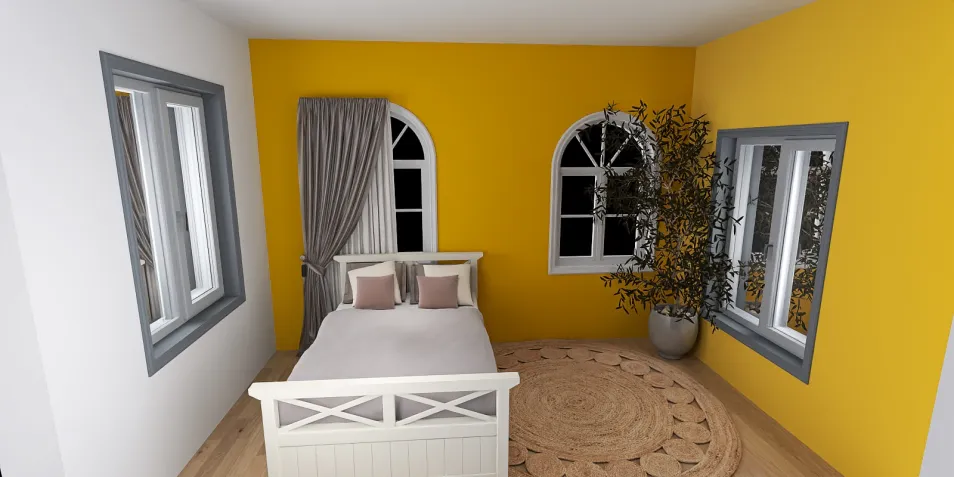В этом пространстве, где желтые стены словно солнечные лучи, а окна обрамлены серыми рамами, царит тишина. Легкие занавески колышутся, как нежные сны, а круглое ковровое покрытие приглашает к медитации. Здесь время останавливается.