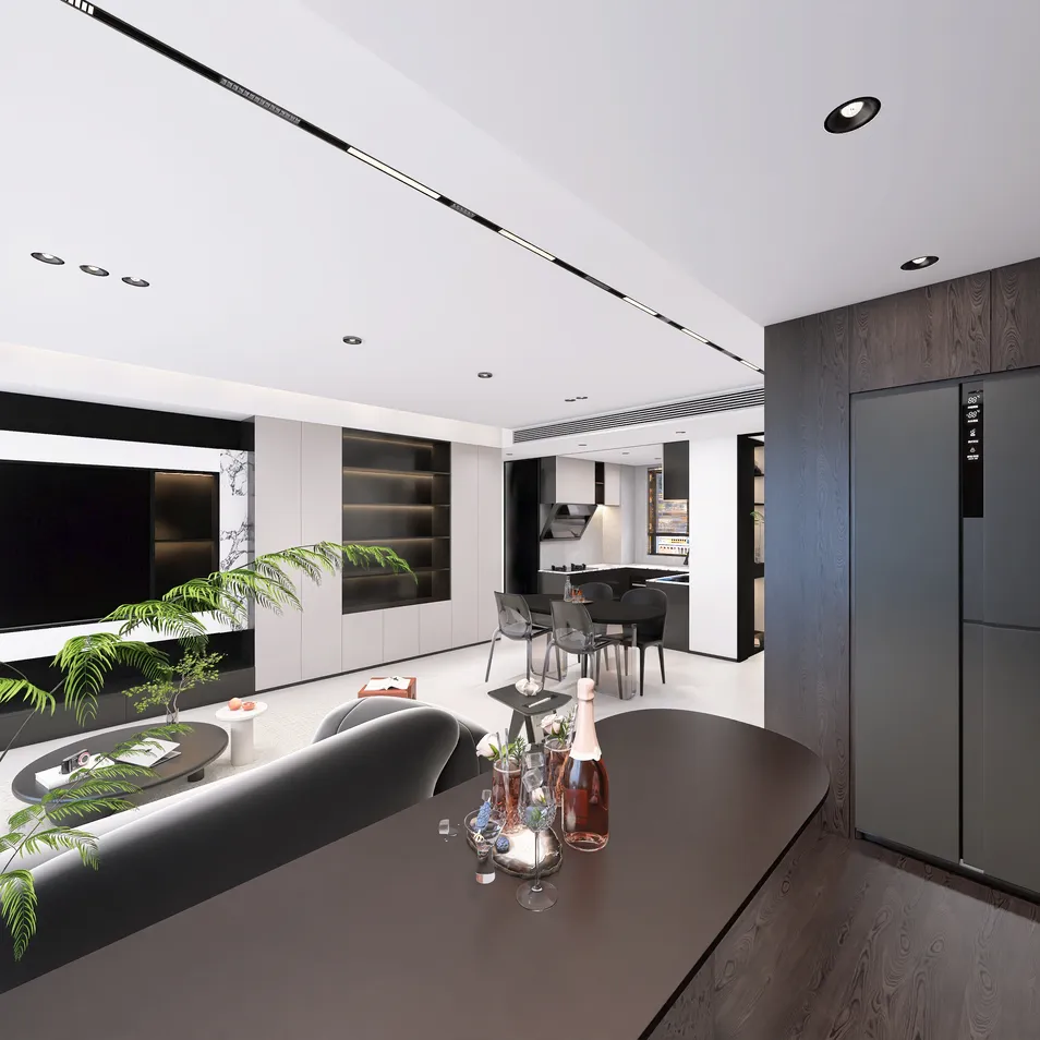 AI功能应用:智能布局规划,智能灯光调节 比赛主题:通过居然设计家的LOGO色卡条形的丰富性,展现出了我们对于现代生活回归的渴望,我们的设计从进入房子那一刻,现代化,空间感,视觉感满足现代年轻对于现代生活期的期待 落地状态:已落地