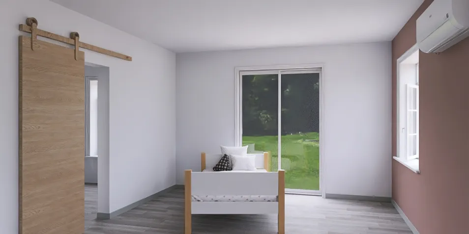 设计理念:这个房间的设计如同一幅静谧的画卷,简洁的家具与自然光线交织,木质滑动门轻巧地分隔空间。墙面淡雅,窗外绿意盎然,仿佛每一寸都在诉说着生活的恬淡与宁静。