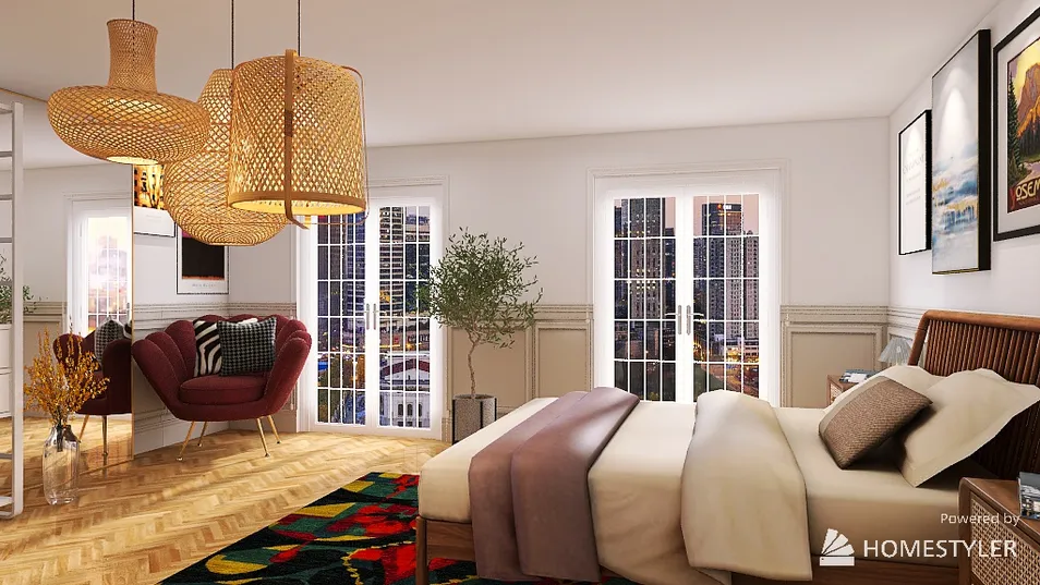 I started my project with french door and windows. I added the wall-lining a little later and I think it perfectly complements the white walls. The open closet was a bit of a gamble, but I think it's going to look beautiful with a orderly person. You don't see "the green corner" in the cover picture, which is a shame because I really like it. It can be used as a work desk or anything that you want. I also added an interesting pieces as a wooden chair in the mentioned "green corner". You'll see more of yourself.