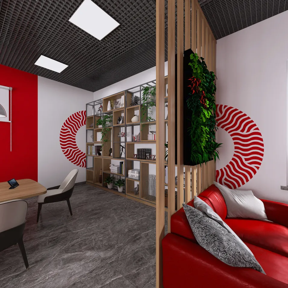 Дизайн интерьера переговорной комнаты в фирменном стиле. В дизайне использован логотип фирмы и фирменные цвета: красный, белый и зеленый. Красный подобран по Ral