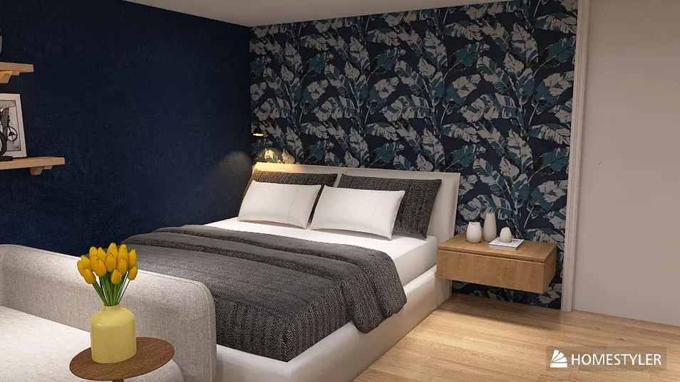 The 30-square-meter apartment is a well-designed, compact space that maximizes functionality and style. The open-plan layout features a cozy living area with a light-colored sofa next to a double bed set against a navy blue accent wall with floral wallpaper. A small kitchenette with white cabinets and wood countertops includes a two-burner stove and sink. The bathroom, sleek with gray tiles and white fixtures, is tucked away beside the bed. The space feels airy and inviting, with thoughtful design touches throughout.