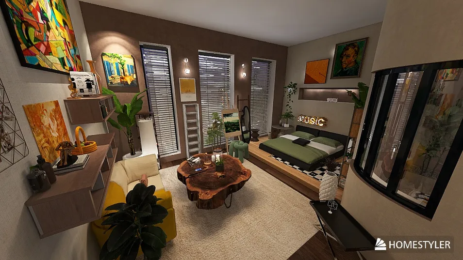 A modern, cozy interior with an earthy color palette of green, brown, and mustard yellow. The open-plan space seamlessly blends the bedroom, living area, and kitchen, creating a warm and inviting atmosphere. Organic elements like wooden textures, indoor plants, and soft lighting enhance the natural feel. Large windows allow ample natural light, while stylish décor and functional furniture maximize comfort and aesthetics.