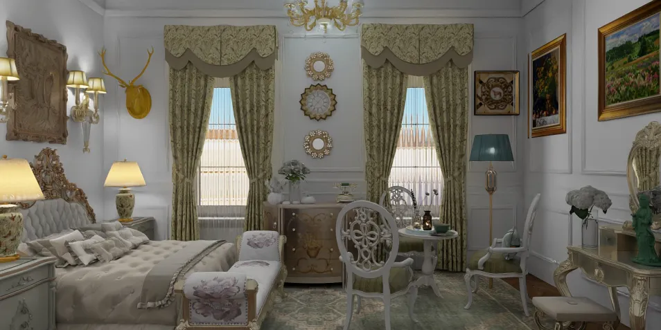 🛏️ The bed, with its ornate headboard, exudes a royal charm and becomes the centerpiece of the room. - 🌼 The floral-upholstered bench and golden metallic details perfectly reflect the essence of Rococo. - 🪟 The curtains, with their intricate valances, frame the space gracefully and let in soft natural light. - 🎨 Wall art and decorative pieces—like vases and tabletop designs—infuse the room with a unique artistic spirit. - 🪞 The soft palette of beige, green, and gold brings warmth and serenity to the space.