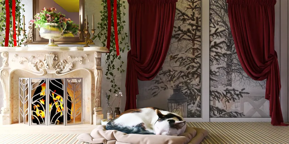 In this serene space, a cat curls up by the elegant fireplace, surrounded by rich red drapes and a touch of botanical life. The warmth of the flames dances softly, casting flickering shadows that whisper secrets of solitude and comfort.