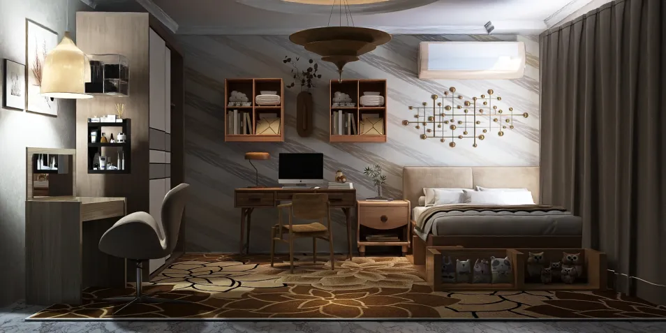 The room invites you with soft hues and gentle textures, where the warm embrace of wood meets the allure of plush fabrics. A study nook whispers promises of creativity, while the bed beckons you to escape into dreams, wrapped in a cozy embrace.