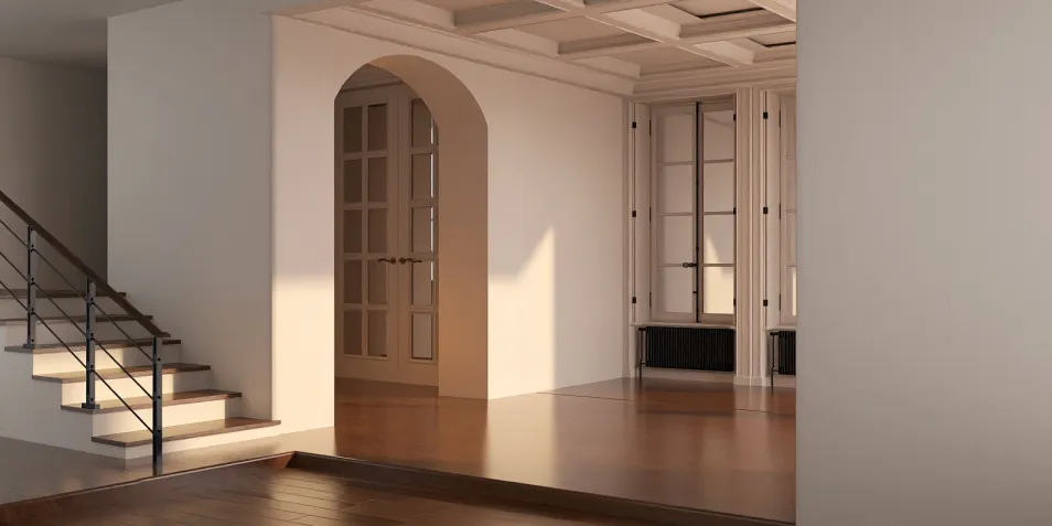 In this minimalist sanctuary, light pirouettes through the archway, casting playful shadows. The warm wooden floor invites bare feet, while the elegant staircase whispers of journeys yet taken. Each corner cradles a promise of possibility, waiting for life to unfold.