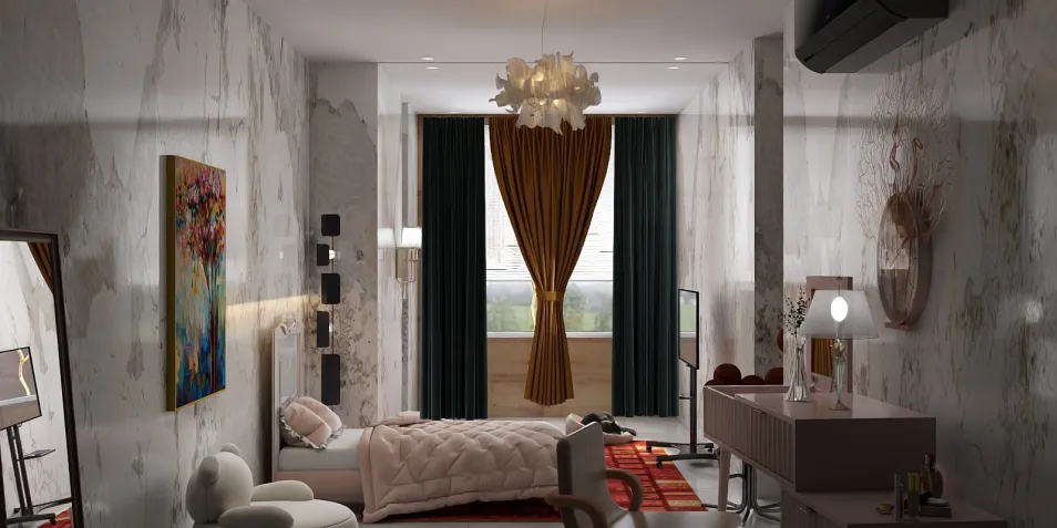 In this refined space, marble walls cradle whispers of opulence. A plush bed, draped in muted tones, invites dreams. Golden drapes cascade like liquid sunlight, while the chandelier hangs, a frozen star in a moment of stillness. Here, luxury becomes a paradox, as comfort teeters on the edge of excess.
