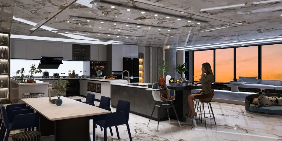 In this sleek kitchen, the glossy marble reflects a sunset's embrace. A woman sips coffee while a child munches cheerfully, the air rich with possibility. Here, every detail whispers sophistication, yet the warmth of home lingers, reminding us that luxury can feel like a gentle hug.