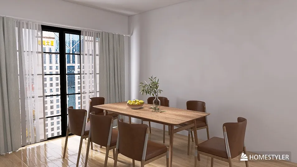 In this dining space, simplicity reigns supreme. The warm wood table invites gatherings,