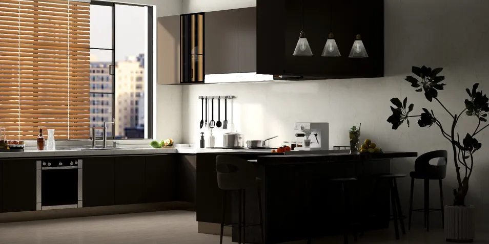 In this sleek kitchen, shadows dance playfully with the sunlight filtering through wooden blinds. The minimalist design whispers of sophistication, with dark cabinetry and polished countertops inviting culinary creativity, while a single plant breathes life into the angular space.