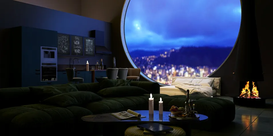 In this sleek urban sanctuary, the vast window frames a twilight canvas, where city lights twinkle like distant stars. Plush, oversized cushions invite languid repose, while flickering candles cast a warm glow, whispering secrets of solitude and serenity amidst the night’s embrace.