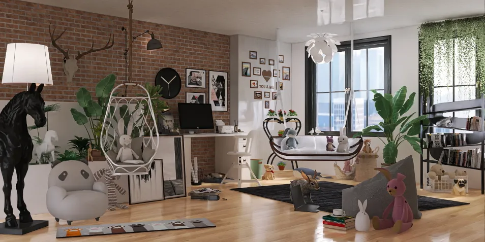 i like plants and industrial vibes & my partner likes hanging chairs, animals, and plushies so i made a room for us both to enjoy :3