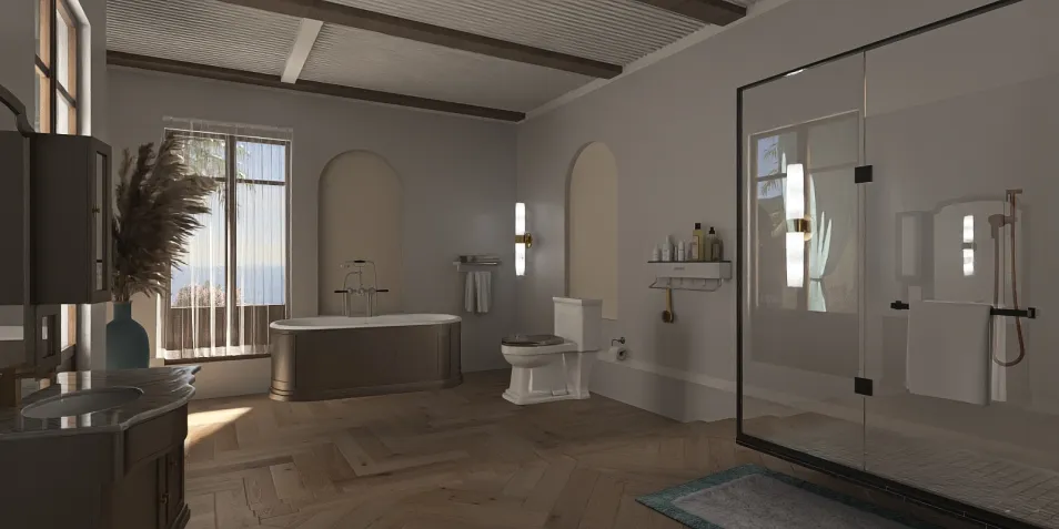In this tranquil bathroom, sunlight filters through sheer curtains, casting gentle patterns on the warm wooden floor. The freestanding tub invites relaxation, while the glass shower exudes modern elegance. A perfect blend of comfort and style, a true retreat from the world.