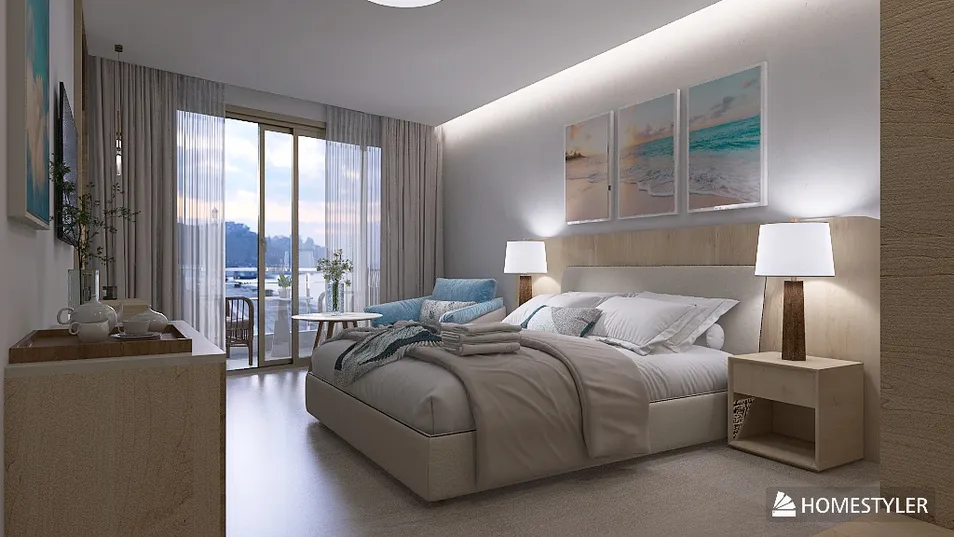 Hotel room with soft hues and natural colors. A plush bed awaits, complemented by cozy seating and a balcony that invites the outdoors in. Minimalistic decor