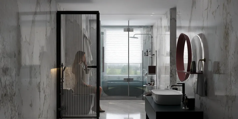 In this minimalist bathroom, sleek glass and stone create a tranquil space. The gentle interplay of light through the textured glass invites reflection, while the modern fixtures offer both elegance and functionality, turning daily rituals into moments of calm.