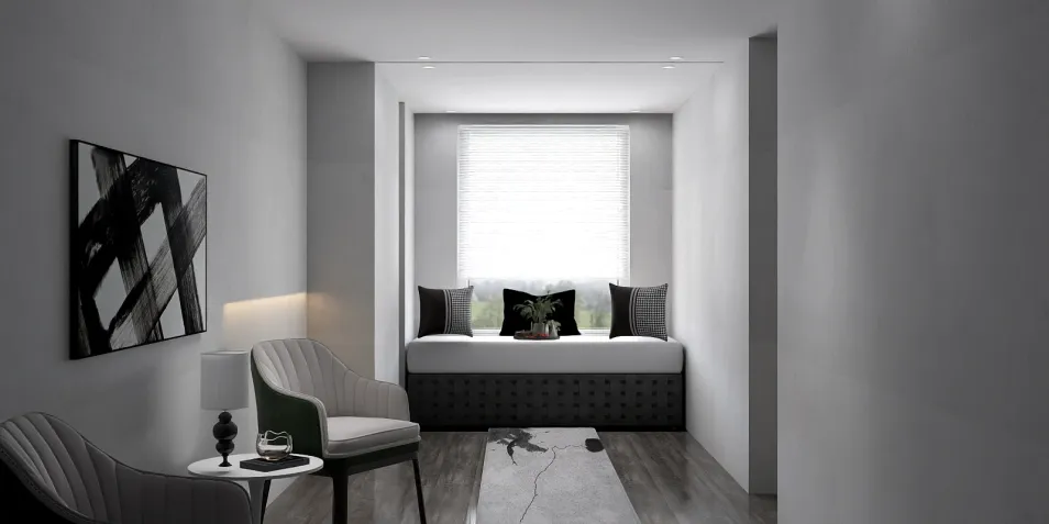 This minimalist space invites introspection. The soft gray walls contrast with a bold coral accent, creating a calm yet vibrant atmosphere. A cozy window seat beckons, while the interplay of light and shadow dances across the floor, whispering stories of solitude.