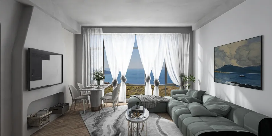 In this sunlit space, sheer curtains dance with the breeze, framing a breathtaking ocean view. The soft curves of the sofa invite you to sink in, while a minimalist table holds whispers of past conversations. Here, tranquility reigns, where every detail breathes calm.