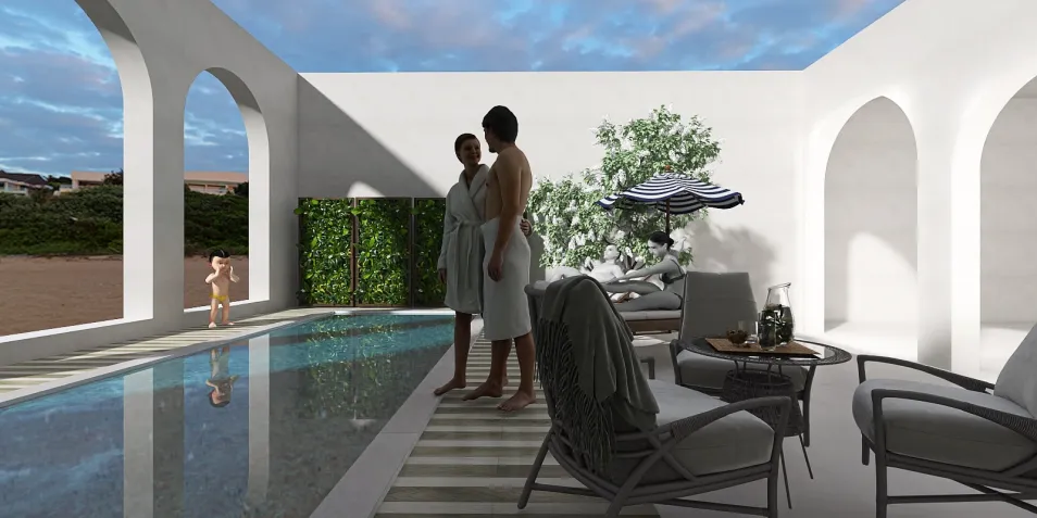 In this tranquil space, sunlight dances on the water's surface, reflecting soft hues of blue and green. The minimalist design invites relaxation, with elegant seating positioned for quiet conversations, while a child’s laughter echoes in the background, reminding us of carefree moments.