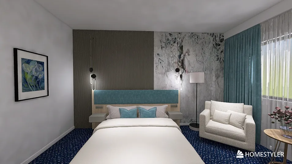 In this tranquil space, soft blues mingle with muted textures, echoing whispers of comfort. The bed, draped in crisp linens, invites repose, while the delicate floral tiles in the bath sing of fleeting beauty. A perfect refuge, where time dances slowly, yet never lingers.