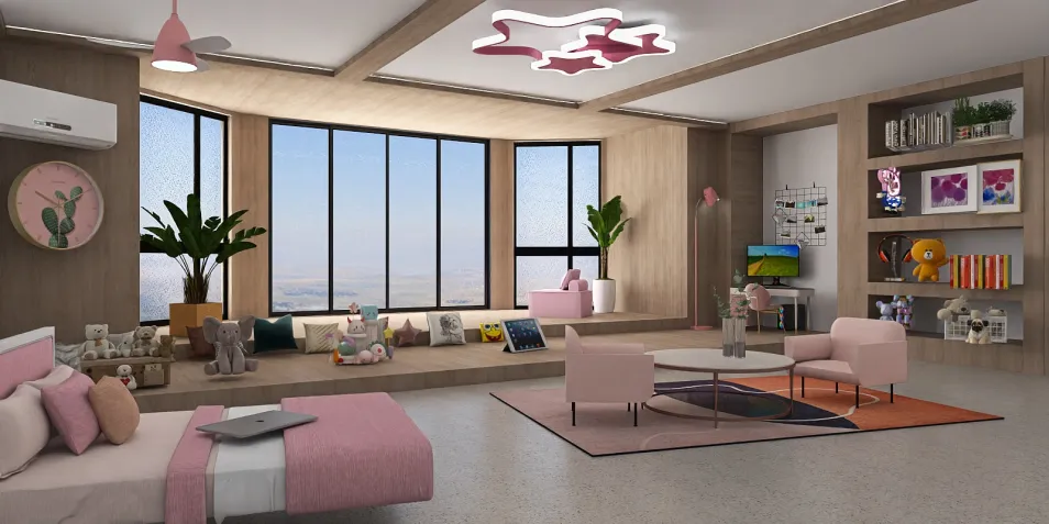 In this modern oasis, sunlight dances through expansive windows, casting playful shadows on soft pink furnishings. A harmonious blend of nature and design invites relaxation, while curated art pieces whisper stories of creativity. This space, a testament to comfort, feels like a gentle hug from home.
