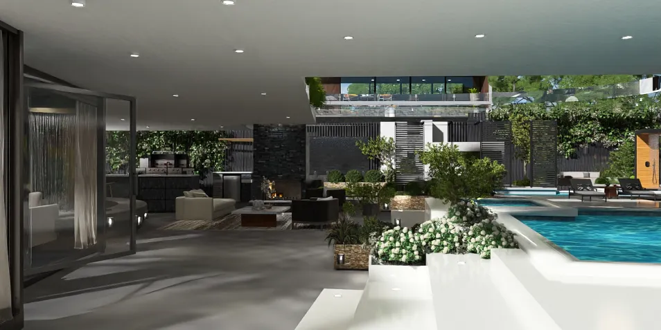 The space breathes tranquility, where modern sustainable design meets nature's embrace. Sunlight filters through lush greenery, casting playful shadows on sleek surfaces. A pool glimmers invitingly, creating a perfect harmony of relaxation and sophistication, making every corner a quiet haven.