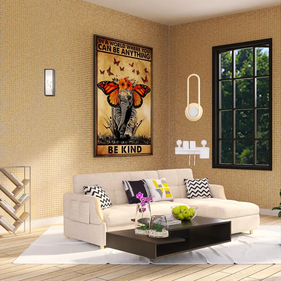 In this room, where sunlight dances through the windows, an elephant adorned with butterfly wings whispers of change. The walls, like woven dreams, cradle a message: 'Be Kind.' A modular sofa awaits, ready to reshape moments, while laughter floats like the scent of blooming possibility.
