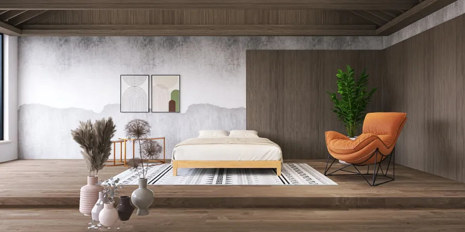 In this sanctuary of serenity, where the whispers of wood meet the sighs of soft textiles, one might ponder: is simplicity not the most beguiling of all complexities? The orange armchair, a defiant sunbeam amidst muted hues, dares us to embrace comfort over grandeur.