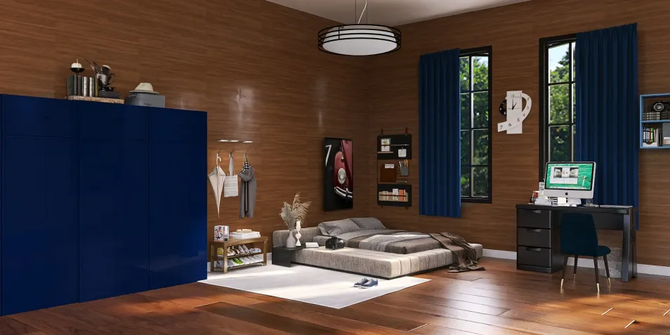 In this room, where navy whispers against warm wood, the bed lies like an unmade promise, draped in sheets that dream of lost afternoons. Here, simplicity reigns, yet one wonders: is the clutter of thoughts more taxing than the order of chaos?