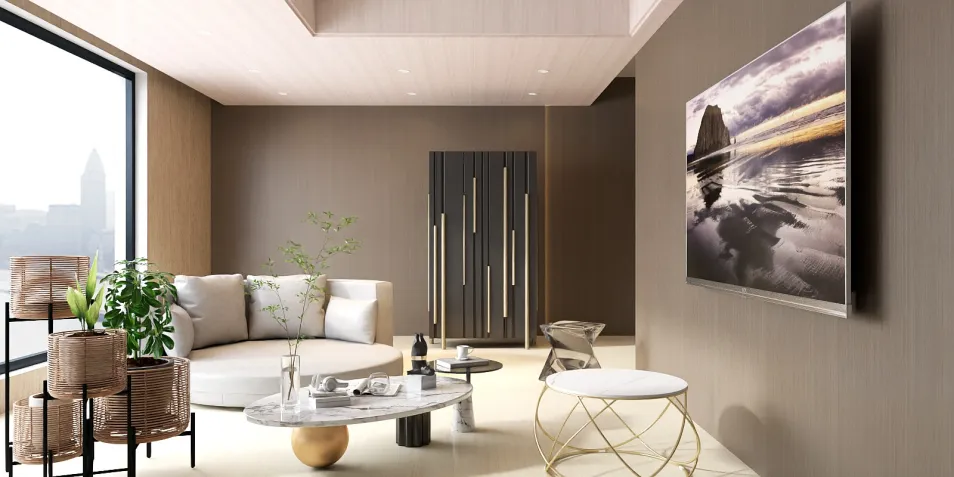 @niaah_solutions In this sanctum of simplicity, where the walls whisper secrets of muted elegance, a circular sofa lounges like a forgotten dream, while the glassy table reflects the ephemeral nature of existence—after all, is not luxury merely the art of being alone together?