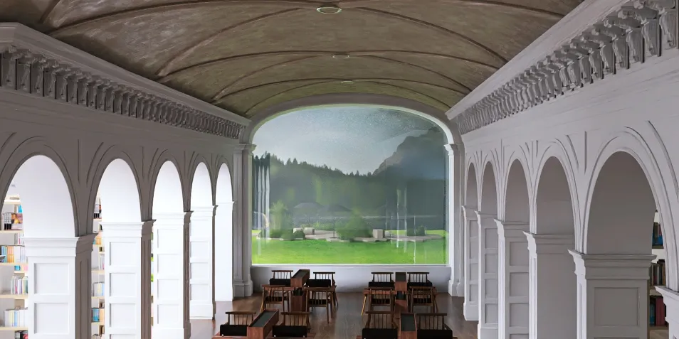 In this ethereal library, arched ceilings cradle whispers of forgotten tales. The walls, adorned with a mural of distant mountains, beckon the solitary reader. Each wooden chair, a quiet companion, invites you to lose yourself in pages while time drifts like a forgotten melody.