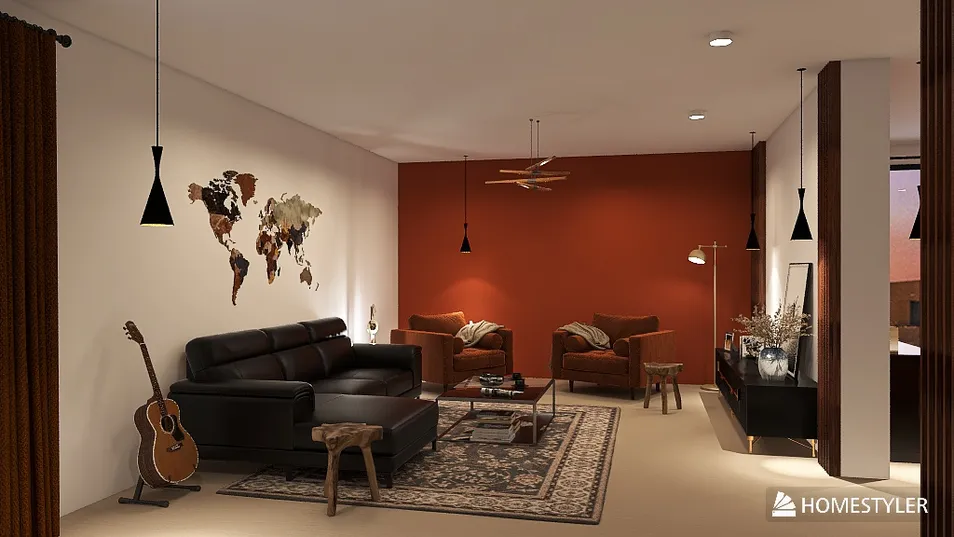 This space reflects a warm and cozy atmosphere, harmoniously combined with the theme of travel. Warm shades dominate: a rich red-red on the accent wall, which creates a feeling of warmth and comfort. The neutral cream and beige tones of the floor and ceiling add harmony and tranquility to the space. In the living room, the world map on the wall is a key accent that symbolizes the passion for travel and discovery. A guitar near the sofa complements the image of a traveler, reflecting the creative spirit and connection with culture. The dark leather sofa looks elegant and functional, emphasizing comfort. Upholstered armchairs and a modern-style coffee table create a place for relaxation and socializing. Minimalist ceiling lights and pendant lamps provide soft, diffused lighting that adds to the atmosphere in the evening.