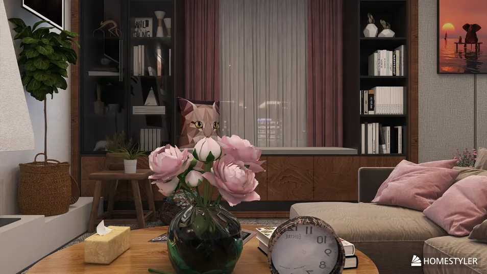 In this dimly lit room, a cat observes from the shadows, its gaze heavy with secrets. Jazz lingers in the air, mingled with the scent of whiskey and wilted roses. A clock ticks, echoing the rhythm of forgotten dreams, as an unfinished novel waits patiently on the coffee table.