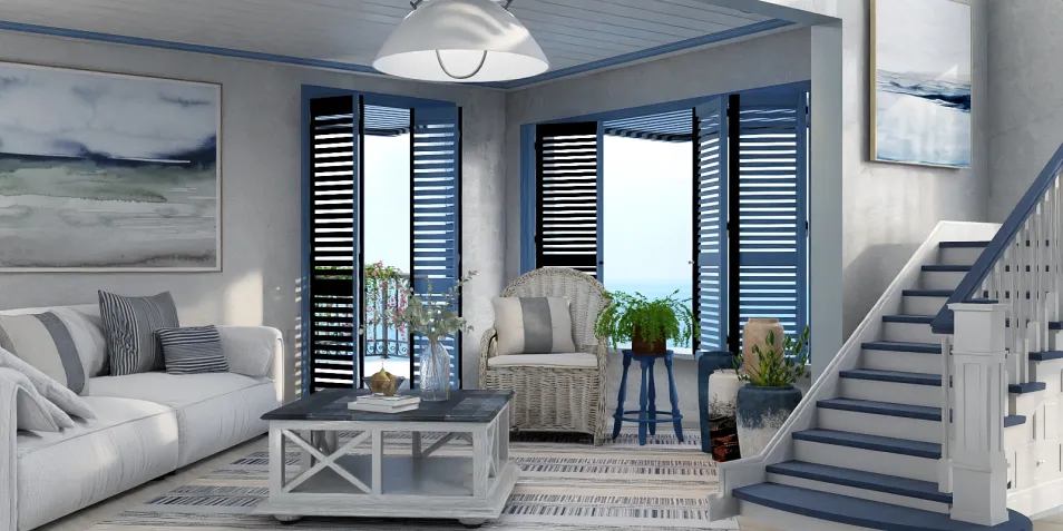 Beneath the azure sky, this living room breathes tranquility. Lattice shutters whisper secrets of the Aegean sea, while a wicker chair cradles afternoon dreams. Here sunlight dances on soft fabrics, as the scent of salt lingers in the air.