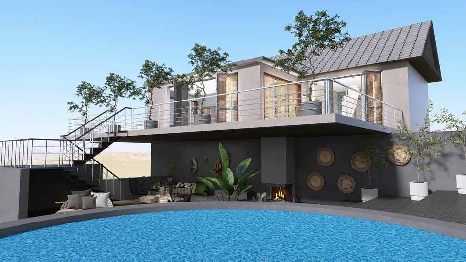In Africa water is the most important resource: it gives life, and it cools down and it's of utmost importance to be used with care and not to be wasted. This weekend country house was built in the untamed countryside and high on the hills above the water! To make the best of the outdoor view, they used different levels in the building to create areas for entertaining, relaxing and sleeping. One bedroom, one bathroom but with enough entertaining space! Small, but with a heart as big as the African continent it was place on and with a heart as warm and welcoming as the African sun!!