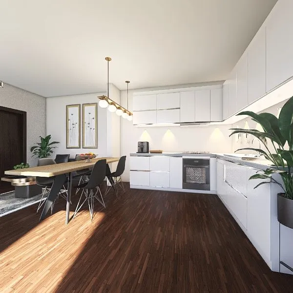 This chic small apartament is perfect for a young adult moving away for college. It features an open space living with kitchen, a small minimalist bedroom and a fancy bathroom.
