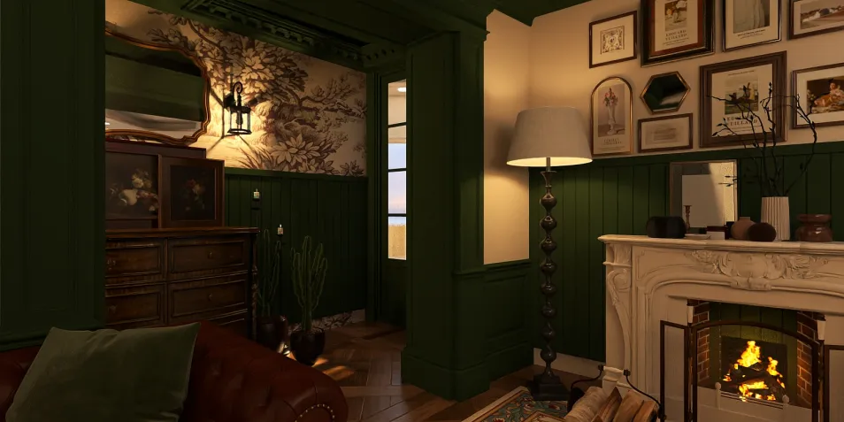 In this cozy nook, deep green walls cradle vintage art, while the flicker of a fire dances over polished wood. Each piece tells a story, echoing the charm of a bygone era, inviting you to linger in nostalgia.