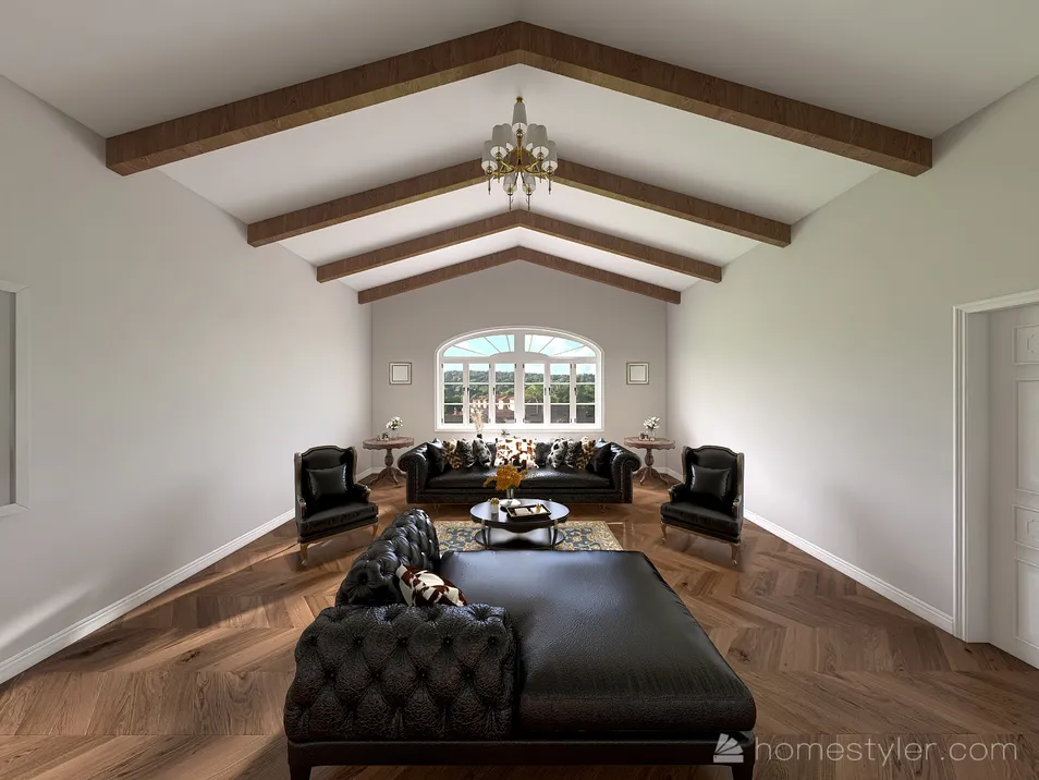 This is an American living room with a sloped ceiling. To capture the American style of this interior I decided to use light beige paint on the walls, warm dark-colored wood that is complemented by white baseboards, door and window frame as well as some patinated brass decors. The seating area consist of a beautiful area rug, a coffee table and the contrasting quilted black leather furniture with patterned cushions while the opposite side of the room consist of cabinets and a fireplace that seems to be the staple decor element in American living rooms.