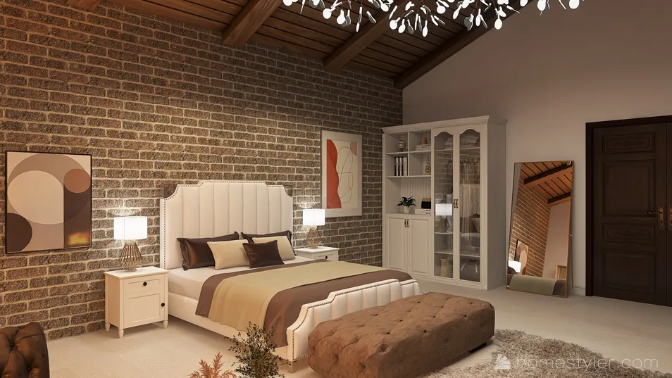I chose to turn this space into a lovely spacious master bedroom. The sloped wooden ceiling and the combination of wood, stone and warm tones gives the room cozy vibes. Exept of the fireplace which is in front of the bed I put there this fancy american style sofa, next to the Christmas tree, because why not bring Christmas a little sooner. Hope you like it :).