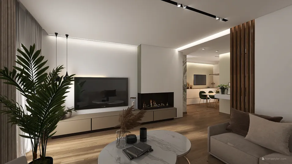 l'abitazione è stata pensata con una zona d'ingresso e poi una cappottiera.la zona living è molto grande e si presenta con un camino elettrico. la cucina è separata dalla zona pranzon con due porte scorrevoli. lo stile della casa è contemporaneo, con colori neutri intramontabili