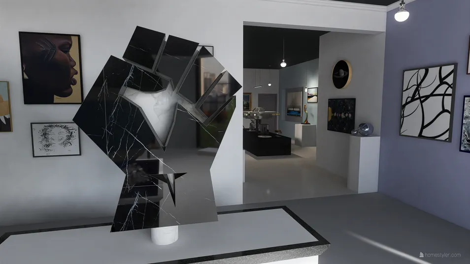 Art Gallery Project with 5 custom created art sculptures that highlight a relevant topic of 2020, 2 emergency exits, 1 main entrance, and 2 washrooms.